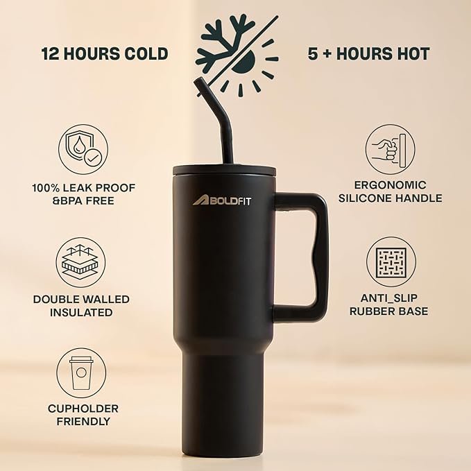 - COMFORTABLE GRIP & TRAVEL-READY: Designed with your comfort in mind, the Boldfit travel mug tumbler features an ergonomic grip that feels natural in your hand. The sleek, slim base fits effortlessly into most car cup holders, making it ideal for travel. With a generous 1.2L capacity, you can enjoy your favorite beverages throughout the day without frequent refills, whether you’re commuting, hiking, or just running errands.